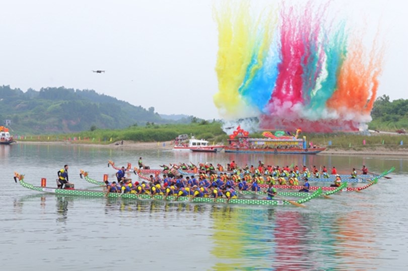 12日上午,在端午佳節即將來臨之際,2021安居古城端午龍舟會在銅梁安居古城拉開序幕。競渡搶江活動中,六艘龍舟像離弦之箭駛向花船。伍向前