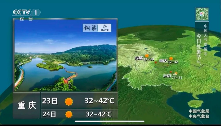 8月22日至9月5日,CCTV-1黃金時段《新聞聯播》播出后, 觀眾在《天氣預報》節目可以看到插播的銅梁區巴岳山玄天湖景區畫面。此次播出依托