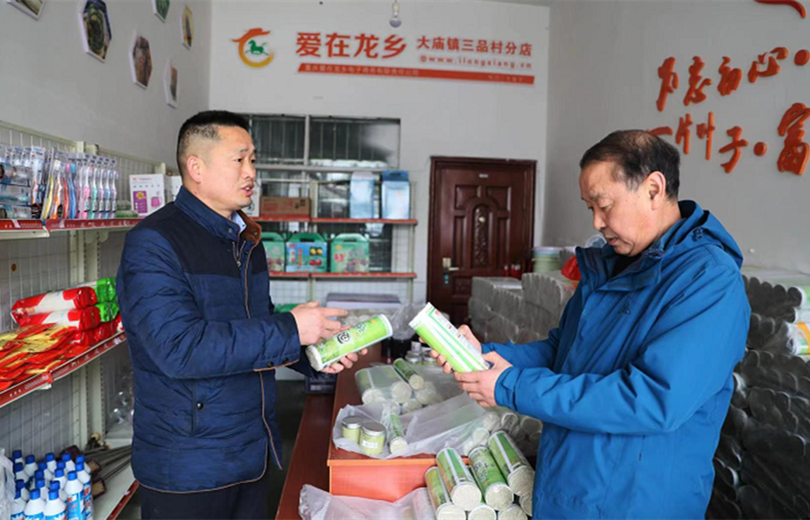3月20日,在大廟鎮三品村黨群服務中心,慕名而來的游客正選購該村開發出來的桑葉面產品。除了桑葉面,由蠶桑產業開發出來的桑葚酒、桑葚膏