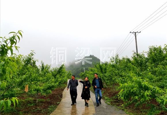 4月22日上午,細雨紛紛。在水口鎮樹蔭村12、13社的山坡上,鎮領導陳瓊、村支書趙安福和重慶機場集團派駐樹蔭村的第一書記趙先平正在冒雨察看桃樹結果情況。