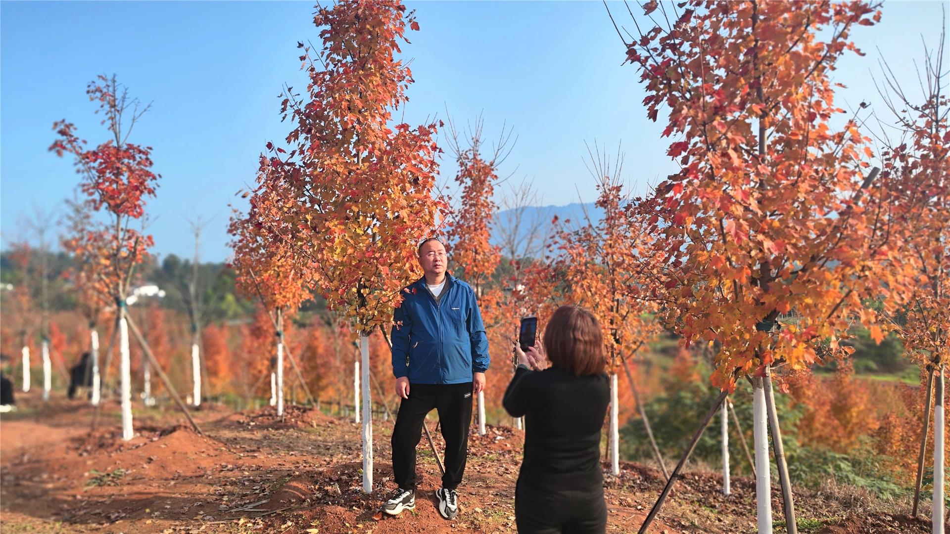 12月1日,在冬日暖陽的照射下,銅梁區西郊紅楓基地的幾千畝楓樹明艷且熾熱,火紅、橙紅、金黃,呈現出斑斕迷人的色彩,吸引了眾多游客前往